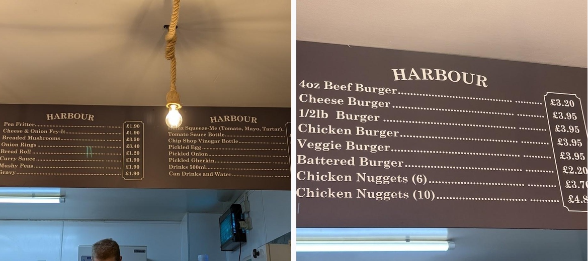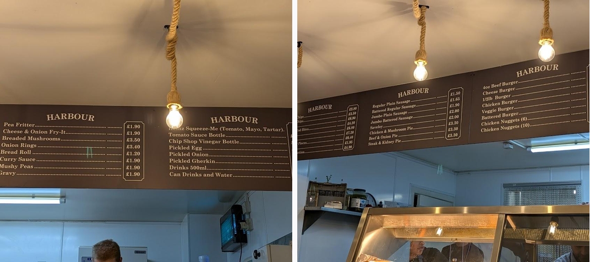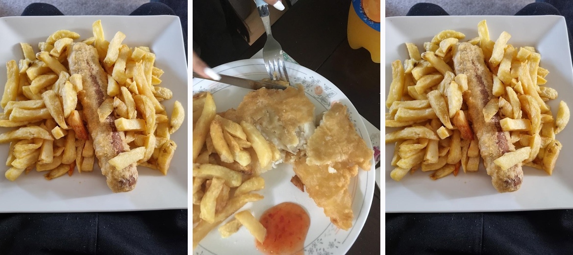 Place was bright and clean, greeted by Smiley happy staff, an cheap prices. £5 for large chips and jumbo battered sausage. Also had chips left over in the bag, wouldn't all fit on my plate, picture below. Overall great ! Will be definitely visiting again 👍🏻